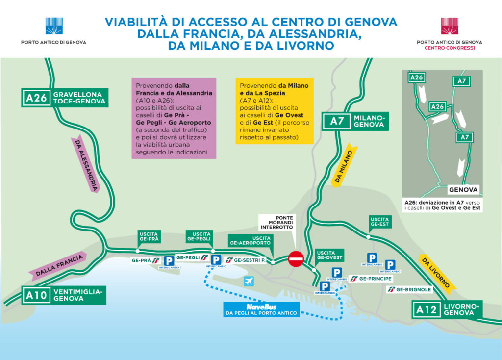 In collaborazione con la Direzione Mobilità del Comune di Genova e con Confindustria Genova è stata predisposta una mappa (che potete vedere qui sotto) con le necessarie indicazioni stradali utili per raggiungere il centro di Genova e quindi il Porto Antico e il Centro Congressi ai Magazzini del Cotone.