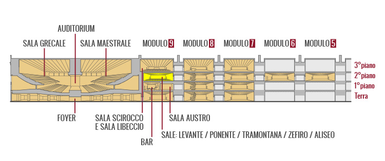 Servita da un foyer con reception e affiancata da sale e uffici, costituisce una valida area di appoggio alle sale maggiori.