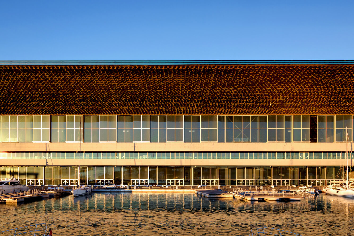 Non esiste separazione tra contenitore e ambiente circostante diversamente da quanto accade di norma nei padiglioni fieristici. Il grande tetto a sbalzo costituisce copertura per le terrazze e per le barche ormeggiate in banchina, le grandi vetrate e le stesse terrazze garantiscono la continuità tra l’interno e lo spazio circostante, le marine, e una visuale aperta a centottanta grandi sull’ingresso del porto con il viavai di navi da carico e da crociera.
